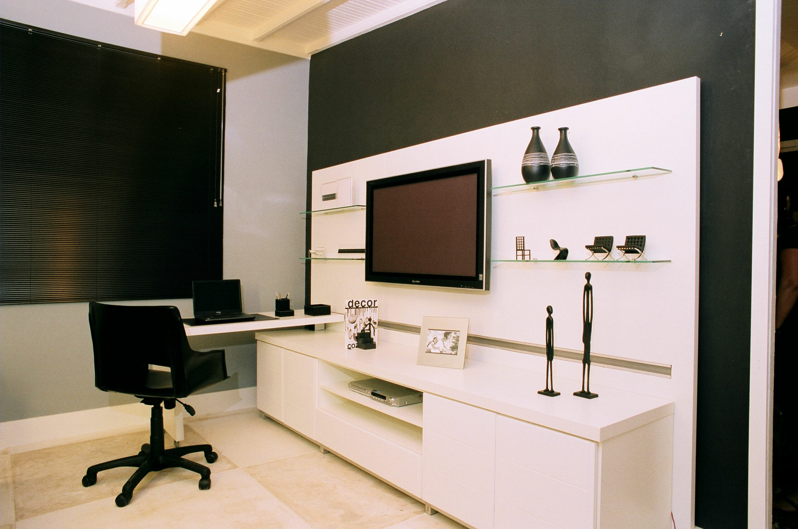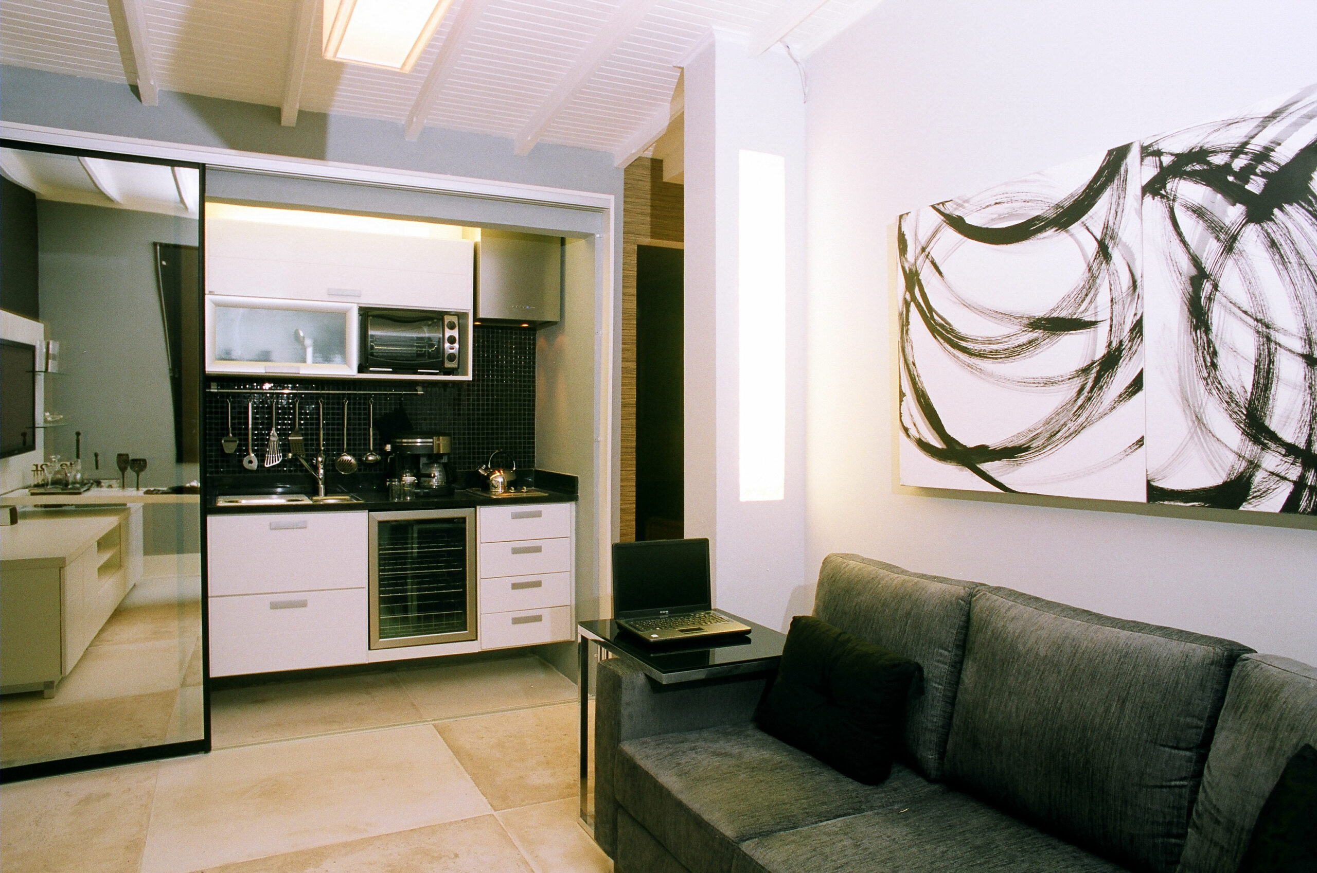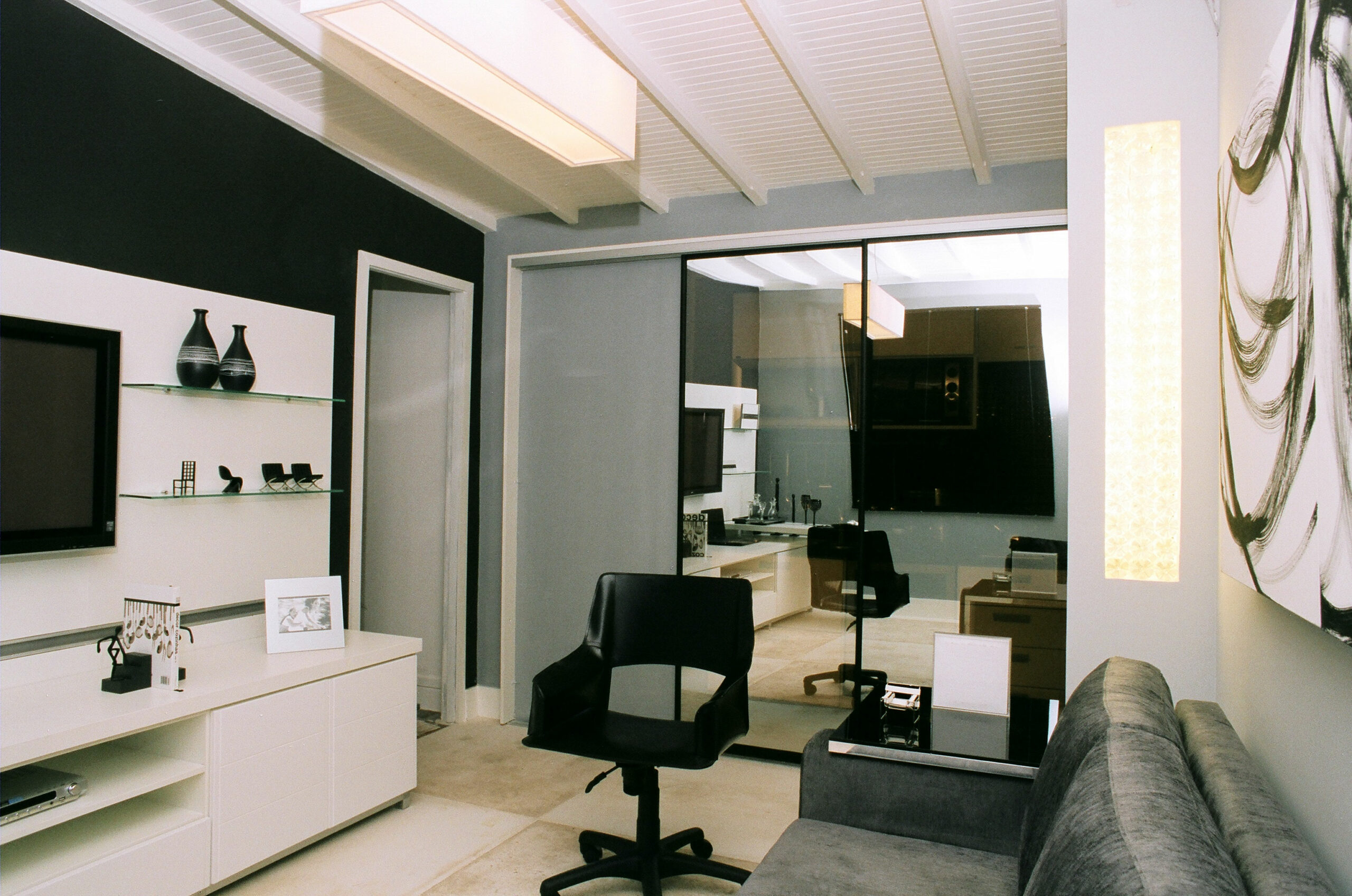 Espaço projetado para atender um jovem executivo que vive no Rio de Janeiro e trabalha em uma empresa multinacional, viajando frequentemente a trabalho. O ambiente, com apenas 13.80m², foi concebido para ser prático e atender diversas necessidades do rapaz, incluindo estar, escritório, sala de TV, jantar e cozinha. No estar, há um sofá em chenille grafite que se transforma em divã com o apoio de um puff, além de uma mesinha com rodízio e luminária de parede. Acima do sofá, há uma tela de arte e uma prateleira para livros e objetos decorativos. O escritório é criado com uma mesa deslizante sobre um rack, que também serve como apoio para jantar. A cozinha compacta possui bancada, fogão, coifa, microondas e frigobar, tudo em um nicho fechado por portas de vidro espelhado. O mobiliário é de madeira de reflorestamento na cor branca, com piso artesanal fabricado em duas texturas. A versatilidade do espaço permite receber até 6 convidados confortavelmente para assistir filmes ou conversar.
